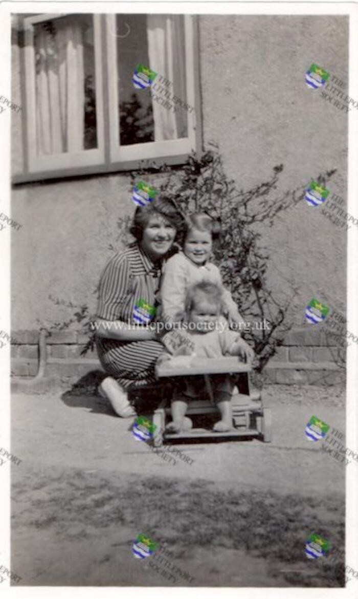 1x black and white photograph of Jess Lenny (née Atkins) with her daughters Judith (standing) and Beryl (in pushchair), at 6 City Road, Littleport.