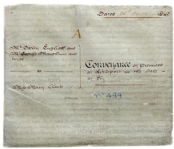 1x folded Conveyance of property at Littleport from Mr Oxley English and Mr George and Mrs Martha Mendham to Miss Mary Clark, dated 26th June 1840.