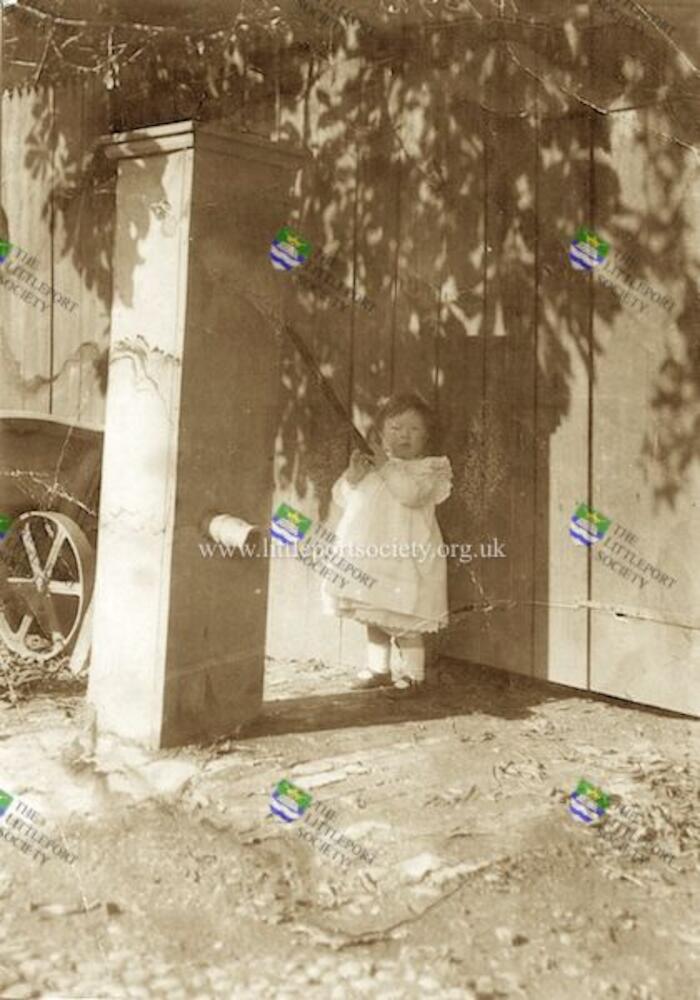 1x copy of a sepia photograph of James Little Luddington beside a water pump at Audley House, Littleport, circa 1904.